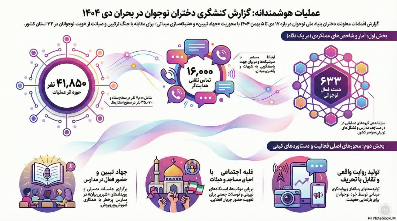 🔸 دی‌ماه ۱۴۰۴، یک حرکت پرافتخار در دل میدان شکل گرفت. در میانه‌ی اغتشاشات، نوجوان تماشاگر نماند و به عنصر اثرگذار صحنه تبدیل شد. معاونت عرصه دختران و راهبران بنیاد ملی نوجوان با شناخت دقیق اقتضائات میدان و با توجه ویژه به نقش حساس دختران نوجوان و جوان، حضور را به سمت کنشگری مؤثر، مسئولانه و هدفمند راهبری کرد.